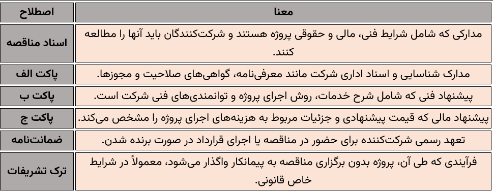 آشنایی با این اصطلاحات، به شما کمک میکند تا فرآیند مناقصه را بهصورت شفاف و بدون خطا طی کنید و شانس موفقیت خود را افزایش دهید.